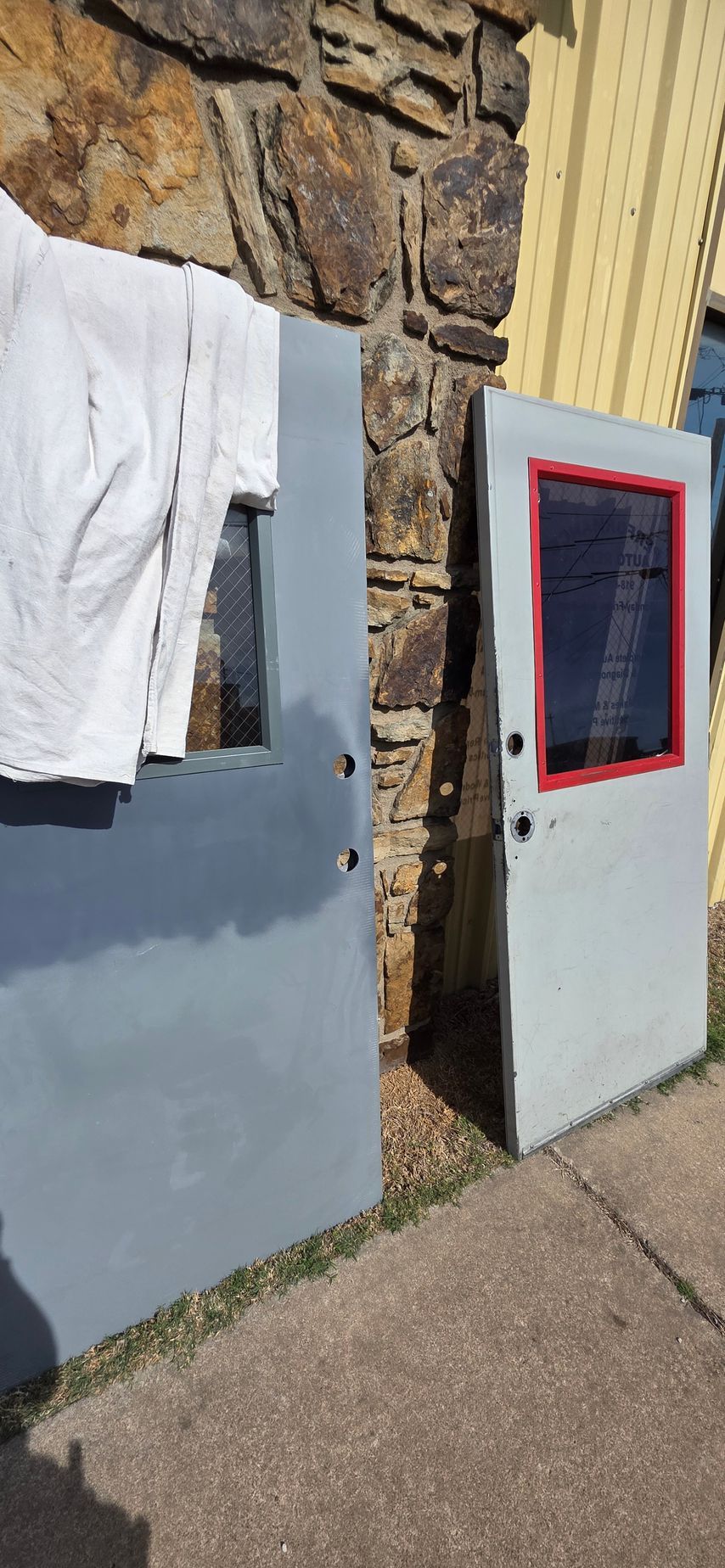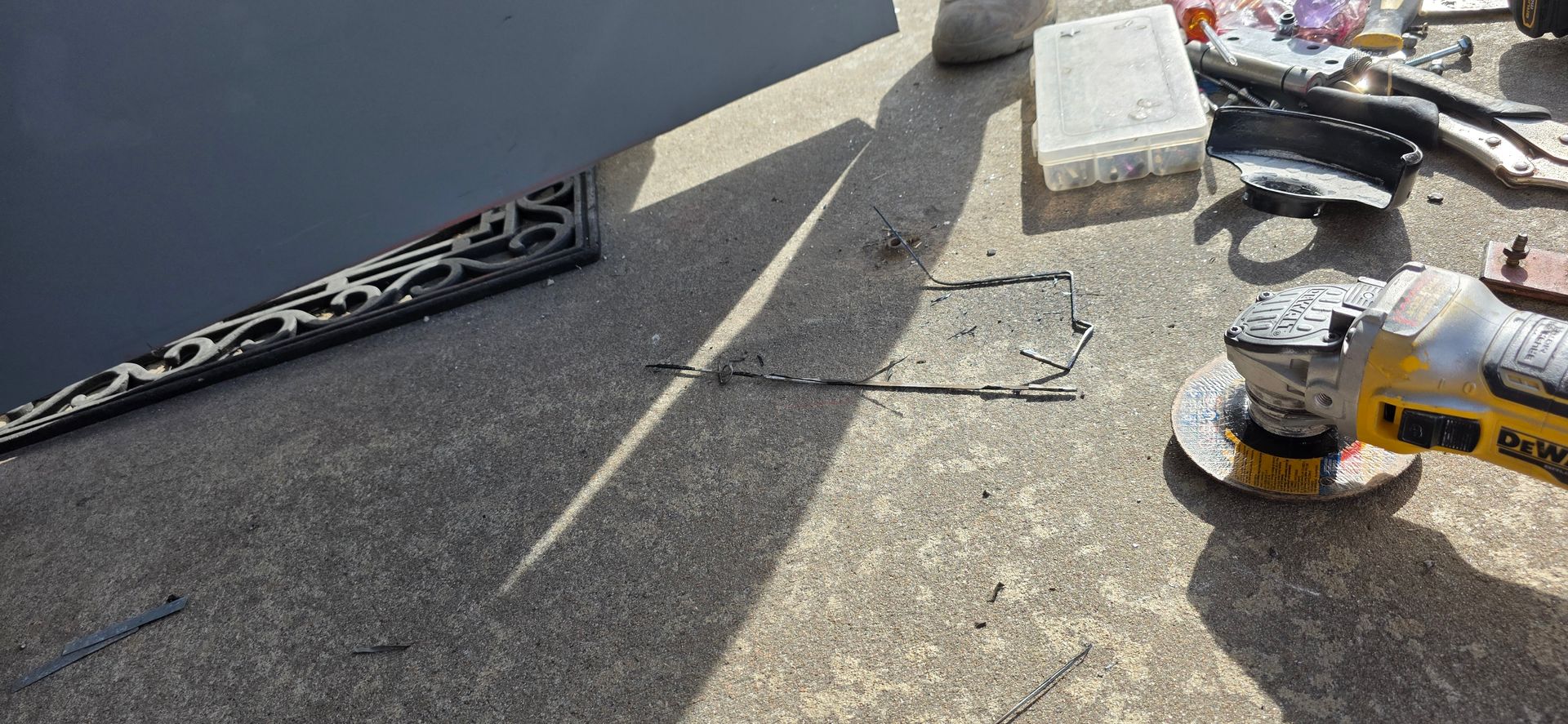 We discovered that the frame was slightly off-level, meaning we had to trim the bottom of the door just a little bit to make it fit properly. This might sound simple, but cutting a metal door is no easy task — you have to do it precisely to avoid warping or damaging the finish.